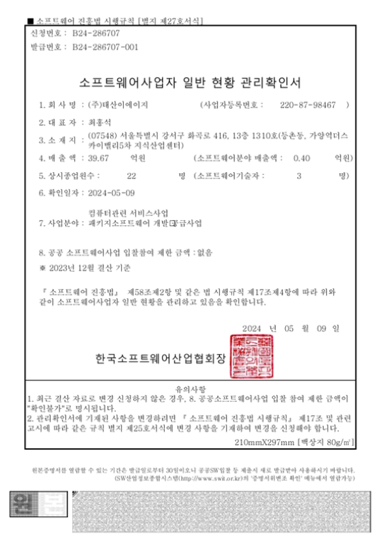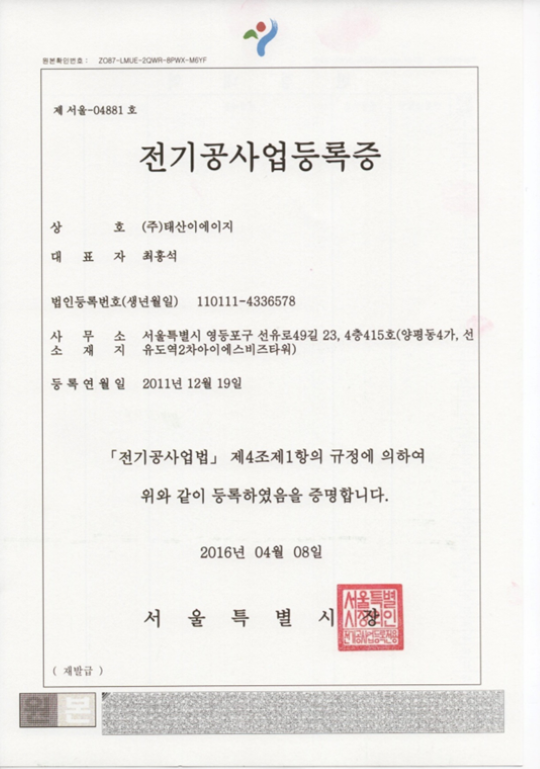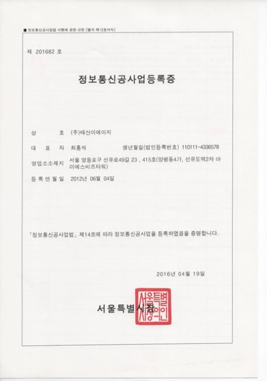 저희 ㈜태산이에이지에 많은 성원과 관심 부탁 드립니다.
