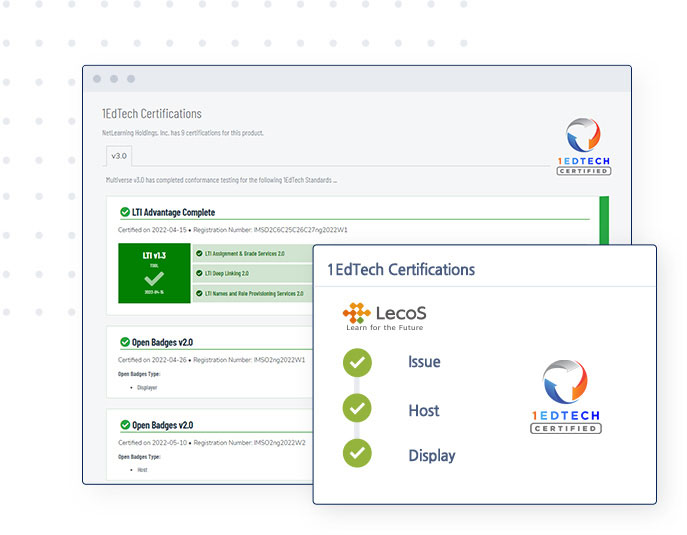 LecoS(네트러닝)의 오픈배지 발행플랫폼은 1EdTech로부터 오픈배지의 3가지 기능인 발행(Issue), 관리(Host), 표시(Display)에 대한 인증을 모두 받았습니다.