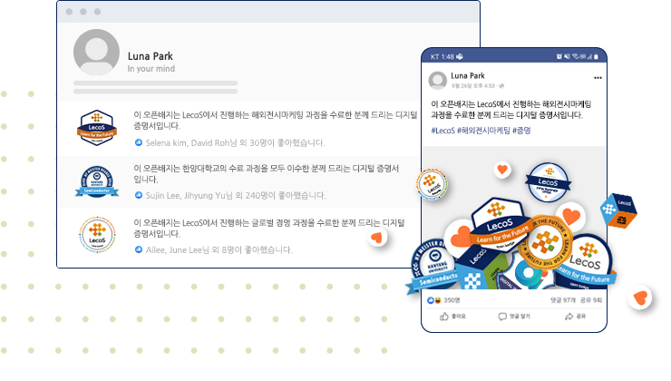 배지 보유자는 트위터나 페이스북, Linked In 등의 SNS에 배지를 공개하여 자신의 스킬을 어필할 수 있습니다.